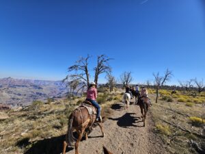 The mules ride nose to tail, so the trek isn’t difficult even for beginners. However those with a significant fear of large mammals should reconsider any horseback riding activity. Those with a significant fear of heights should be fine; the trek nears the canyons edge but the path is wide enough for comfort.