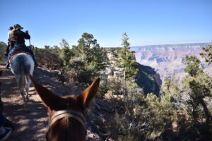 The tour begins at the Grand Canyon Village Mule Barn. That’s where you’ll join the usually large group of visitors to meet your mule. After hopping in the saddle, we began our journey through the brush, slowly making our way to the canyon’s edge.
